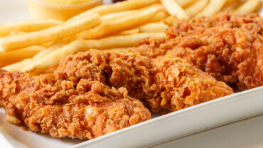 Mini șnițele de pui cu cartofi prăjiți și sos de usturoi